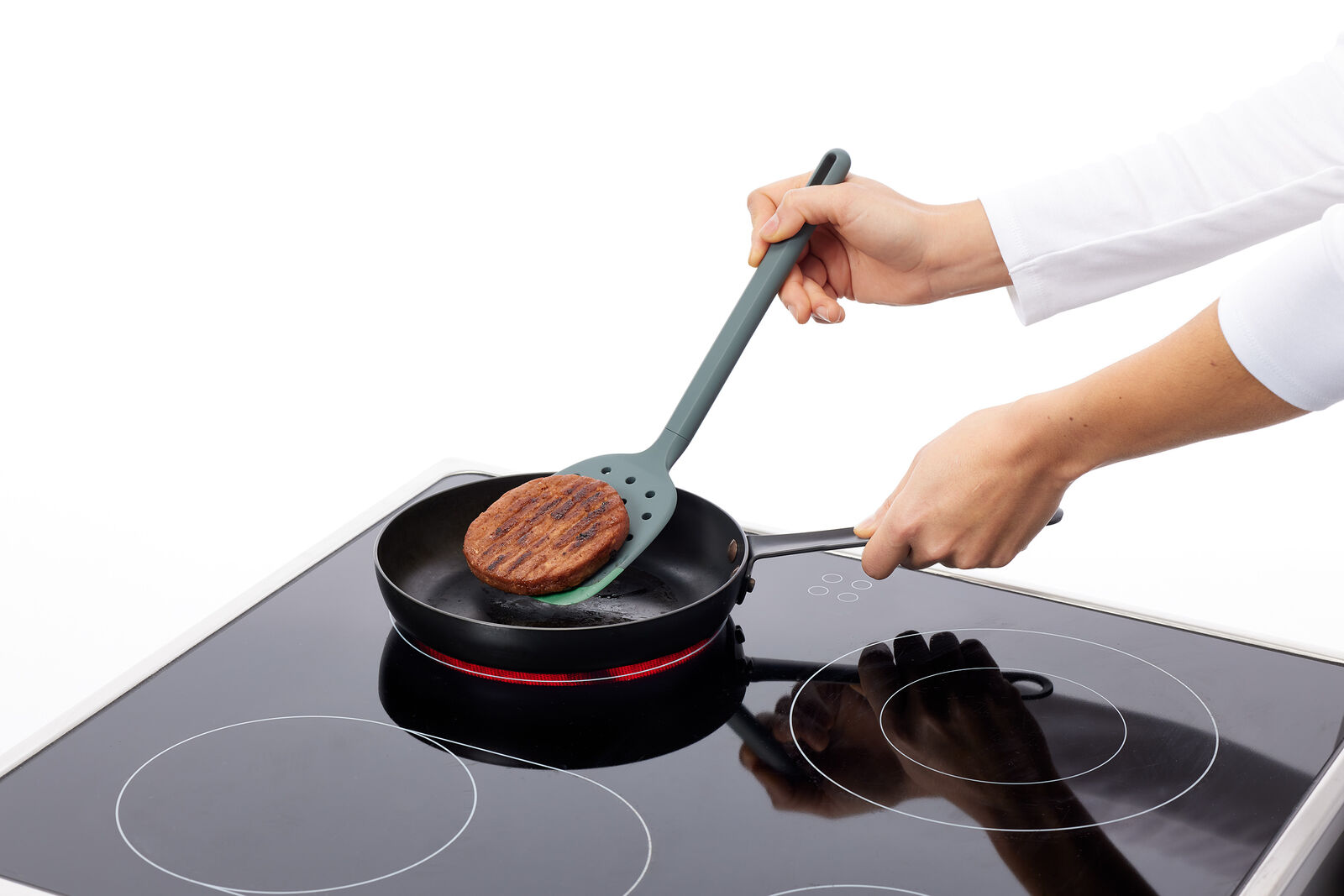 Tato kuchyňská stěrka má ideální úhel a tvar pro zvedání, překlápění a podávání velkých steaků z masa nebo ryb, hamburgerů nebo zeleniny, aniž byste je zlomili.
