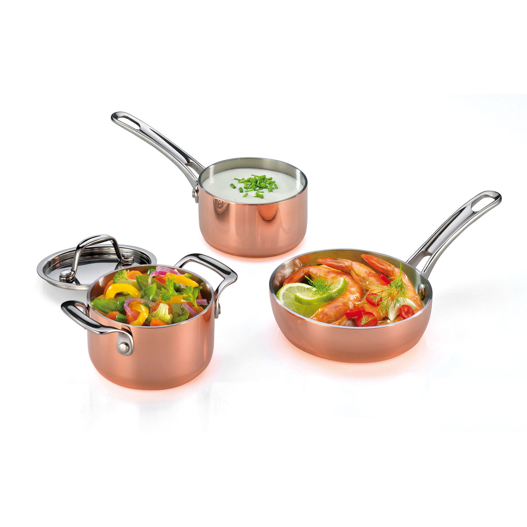 S řadou nádobí CULINOX MINI od SPRING je měď vše, co se třpytí. Hrnec, kastrůlek a pánve jsou ideální pro malá jídla nebo pro stylové servírování pokrmů u stolu. Měď nejenže vypadá úžasně, ale jako vynikající vodič tepla dokonale doplňuje 5vrstvý vícevrstvý materiál, který rovnoměrně rozvádí teplo do každého rohu. To zajišťuje, že krémové polévky, křehké kuře, korýši a čerstvá zelenina budou dokonale uvařeny. Rukojeti z nerezové oceli se pohodlně drží, když hostům prezentujete své kulinářské výtvory. Nádobí Mini je vhodné pro elektrické, sklokeramické a plynové varné desky.
